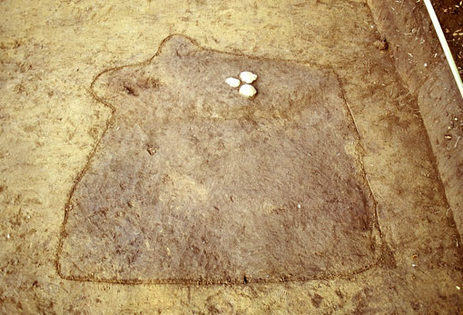 関東ローム層の上面できれいに精査すると、黒色土の落ち込みが確認できます。この写真は、黒色土が四角い形状を示すことから、住居跡であることが推定できます。2箇所突出する部分がありますが、焼土が確認されることから、カマドと推定できます。