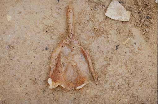 鐙(あぶみ)。1対出土しています。X線さつえいしたところ、銅合金の象嵌が施され、細かい木の葉の文様が確認されています。