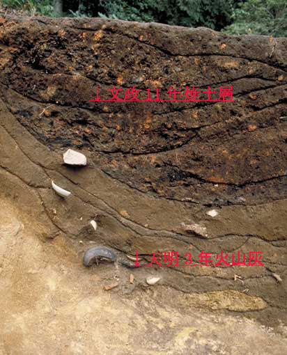 文政11年の火災に伴う焼土の片付け層が厚く堆積している状況が良く観察できます。本溝は、この火災の片付けで埋められ機能しなくなったことが確認されます。