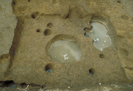 水の溜まった大きな穴2箇所が確認されていますが、これは床下土壙と呼ばれているもので、住居の貼床を剥がすと確認される土壙で、用途不明。