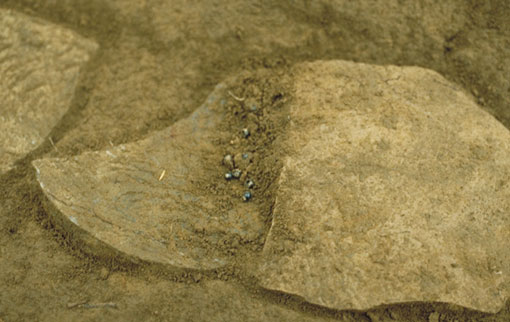 須恵器の大甕の破片の上に、直径2mm程の種(実?)が数点確認されました。樹種不明のため、平成13年度事業で樹種同定の分析に出しています。