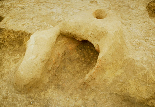 粘土とローム層を混ぜた土で竃を構築しています。煙道が残る状態の良い竃でした。第12b号住居跡の床面を一部切ってつくられています。
