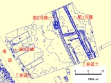 C中島遺跡第1次調査測量図 (遺跡GIS画像をphotoshopで加工して出力) 道路の左側(西側)は、1995年度寺内遺跡班確認調査地点。 現道を挟んで道路の側溝と推定される溝が確認されています。 |