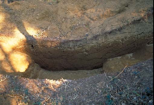 K第4トレンチ北側堀完掘状況・土層断面図(西より)