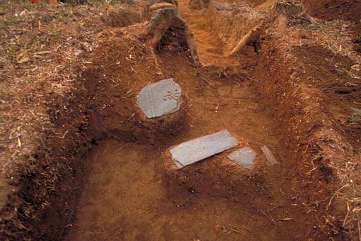 O第5トレンチ板石塔婆出土状況