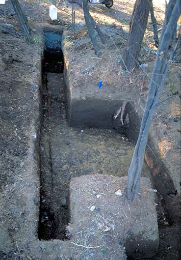最奥部に南北方向に走る溝が確認され、本館跡の西側を画する堀と推定されます。