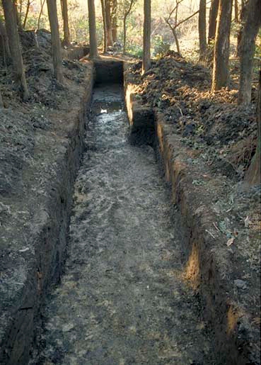 奥に水が溜まっているところが道路(参道?)の側溝。1996年度調査地点で確認した側溝の延長にあたるものと推定されます。