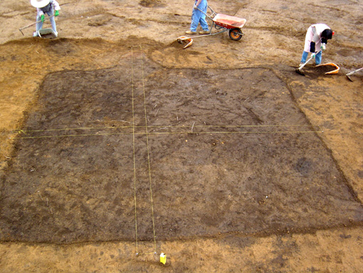 重機で剥いだ面を、精査して、第4号住居跡のプランを確認している状況です。