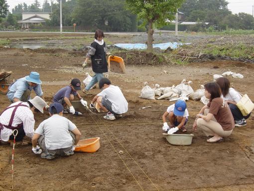 今回は、町内の小学校4〜6年生を対象に体験発掘を実施しました。昨日の雨で、掘ってもらおうと予定していた住居跡が水没してしまったので、足場も悪く、ちょっと窮屈な調査となってしまいました。