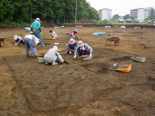 第4・5号住居跡の調査状況です。水糸を十字に張り、土層確認用のベルトを残して掘り下げます。