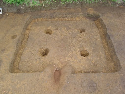 第8号住居跡の完掘状況です。柱穴4本、北カマド、壁下に溝が巡る典型的な住居跡です。