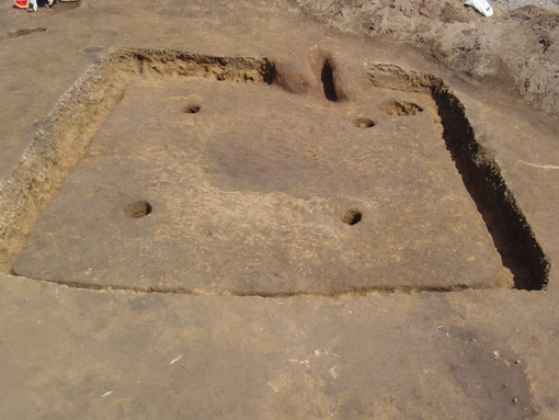 第13号住居跡の完掘状況です。4本柱穴に北カマド、貯蔵穴、壁下の溝が確認できます。