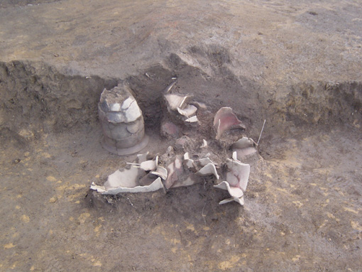 調査区を西側拡張部分で確認された、第18号住居跡カマド付近の遺物出土状況です。カマドの袖に土師器の甕が構築材として伏せて設置され、手前には、横倒しになった甕が潰れた状態で確認されました。