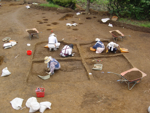 土層観測用のベルトを残して掘り下げている、第6号住居跡の調査状況です。