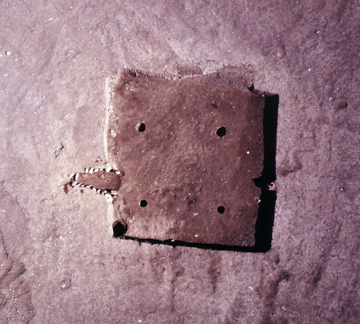L第2号住居跡遺物出土状況 カマド左袖付近の床面に、逆位で出土した、胴部下半を欠く甕。器台に転用? 2004年2月6日撮影。 |