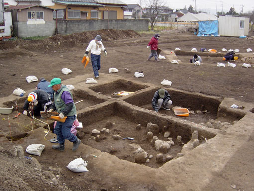 J住居跡調査風景 手前が第2号住居跡です。 2004年2月3日撮影。 |