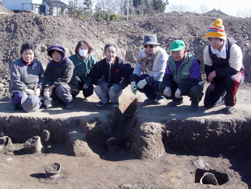 R発掘記念写真 今回の発掘調査のメンバーです。あと3人ほどいましたが、調査最終日、都合により欠のため、7名となりました。1年で最も寒い時期、しかも北風もろの現場、お世話になりました。 2004年2月6日撮影。 |