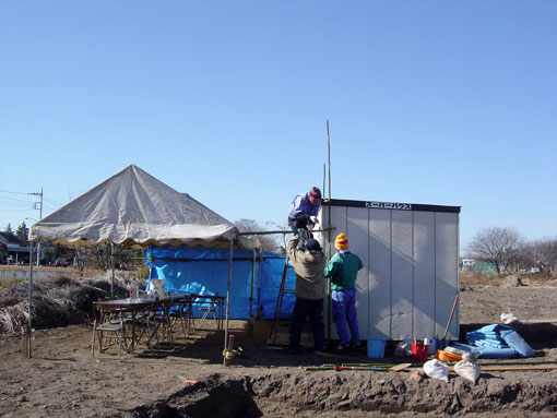 A休憩所の設営 荒川の川原に近く、北風がもろにあたるため、テントの周りに風除けのブルーシートを張っているところです。見た目はちょっと悪いですが、風がよけられれば、陽だまりで結構温かいです。予算があれば休憩用のプレハブでも建てたいのですが・・・・・。 2004年1月20日撮影。 |