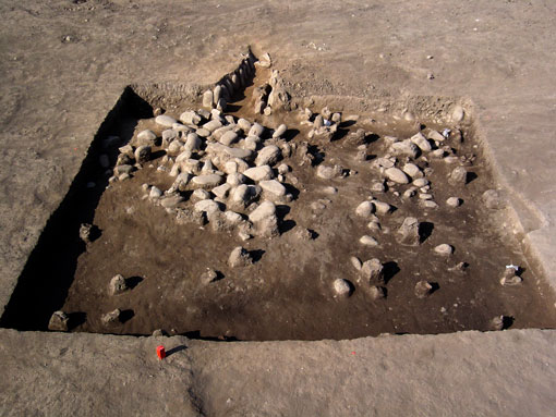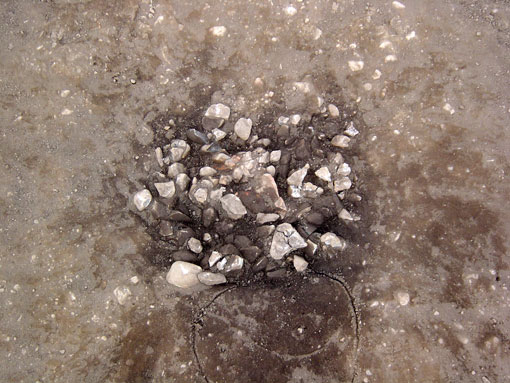 D集石土壙確認状態 円礫混じりの土の中に、割れた礫の集中している箇所があり、精査してみると、集石土壙でした。覆土中に時期の決定できる遺物は確認できませんでしたが、調査区内からは縄文時代中期頃のの打製石斧が出土しており、該期に比定されるものと推定されます。 2004年1月21日撮影。 |