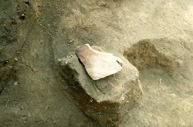 溝の底に近い部分から出土した、中世の陶器片。