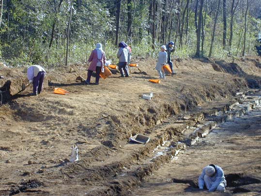 右下で作業していますが、この地点は現道下にあたり、アスファルトを剥がしたところ、遺構(土壙)が確認されたので、急遽調査しました。