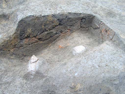 残りの悪い竃ですが、かろうじて検出できました。竃の底面に、土師器の甕の破片がいくつか出土しました。