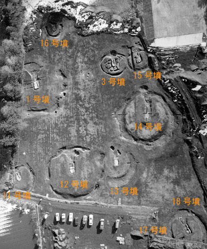 ラジコンヘリにて撮影。10基確認された古墳は、直径25m〜8m程の全て円墳で、7世紀代に属します。かなり密集して分布している様子がうかがえます。