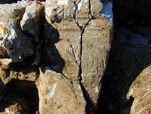 第3号墳石室の外側に掘られた線刻!と思いきや、実は、先のキツネの巣の穴の先がこの石材に当たっており、キツネが先に進もうとして爪で引っかいた、涙ぐましい努力の跡であると推測されます。うっかり見逃すと、拓本でもとって線刻として発表してしまいそうです。
