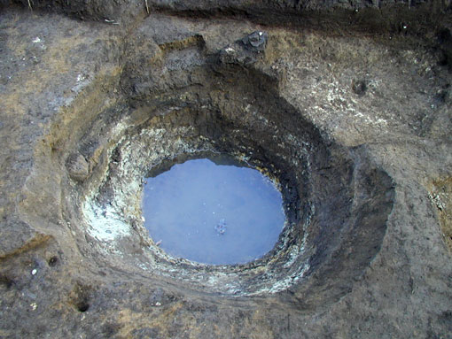 覆土中より近世陶器が出土しています。掘り込みは、青白色の粘土層で止まっています。