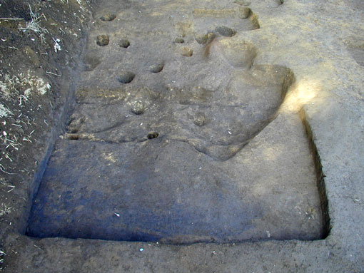 長方形の土壙とピットに切られ、ちょっとわかりづらいですが、奥(北側)にカマドが、片袖だけ確認されています。