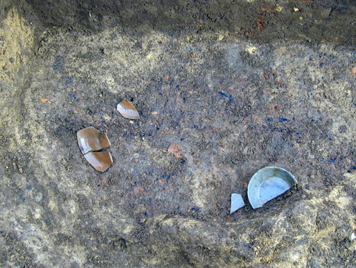 貼床の下に掘られた床下土壙の底部付近より出土した、土師器・須恵器です。壙底付近には、多量の炭化物・焼土が確認されています。
