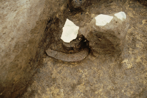21 遺物出土状況。住居跡の壁際床面から、鉄製の鎌が出土しています。