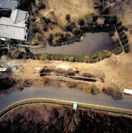 手前の道路(ゴルフ場の外周道路)と池(釣堀の人工池)のトレンチが第3調査地点。