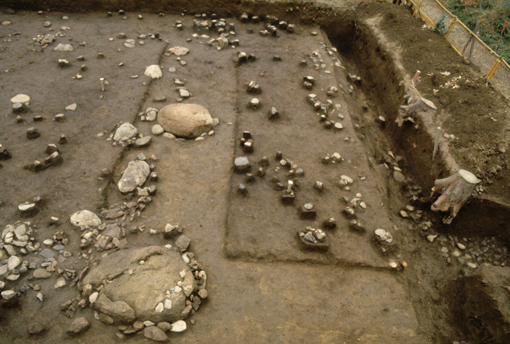 凝灰岩の大型の礎石が3個並んで検出されています。