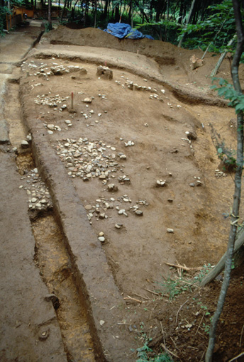 基壇の上は、かなり削平されており、礎石は一つも残存していません。直径2.8m程の心礎の掘方、抜き取り穴と四天柱の礎石と推定される礫が僅かに確認されています。