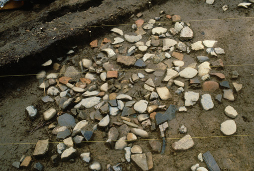 基壇南側に、瓦・土師器・須恵器・鉄釘などの遺物が、ややまとまって出土しています。