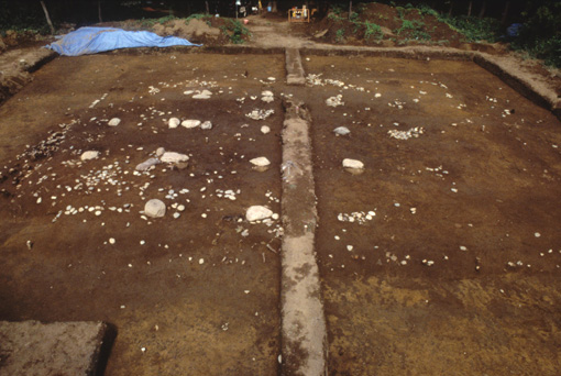 礎石は、桁行五間・梁間四間の30箇所の柱位置を確認しています。基壇の南西隅を中心とした12箇所が良好に遺存しています。