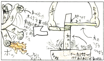 紐ギリ法(ひもぎりほう)と呼ばれる方法で火を起こしています。さらに、摩擦で熱くなった木くずを葉っぱや動物の毛に入れて振り回すとしています。摩擦だけでは、なかなか火が付かないことに気づき、なかなかスルドイ!。