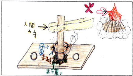 キリ揉法です。木の棒をすりすりして火を起こします。