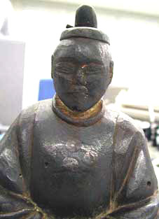 このご神体は、明治の初め頃、八幡神社が今の場所に移転するにあたり、当時の神主の家に預けられ、以後その家の氏神様として大切に奉られてきたとのことでした。このご神体は、胸に梅の紋が付けられていることから、天神様(菅原道真公)と判断されます。