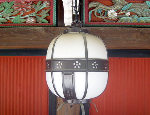 社殿脇の回廊に吊り下げられた丸い燈篭。梅紋の透が見られます。