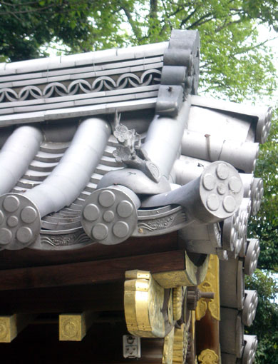 桜門に取り付く塀の屋根瓦。軒丸瓦に梅紋が見られ、丸瓦の上に梅花の飾りが付けられています。
