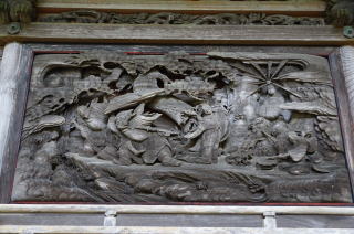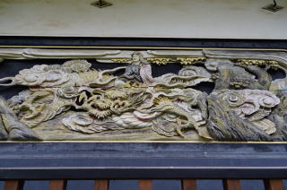 弘化四年(1848)亦八57歳の作品で、欅材による外陣欄間3枚(両面彫刻)と内陣欄間3枚からなり、韓信の股くぐり、鳳凰図(笙を吹く唐子と 簫史:しょうし)、鉄鉢から龍(あごがしゃくれる)を出す陳楠(ちんなん)仙人、麒麟などの彫刻が施されています。
