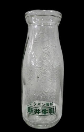 写真のビンは、諏訪木遺跡から出土したくじらい牛乳のガラス瓶です。正180t瓶で、口径4.3cm、器高13.8cm、底径5.2cmを測ります。瓶正面には、消えてしまっていますが、円形の枠の中に、クジラが潮を吹いているトレードマークの痕跡が残っています。底面側面には「ビタミン添加 鯨井牛乳」と印字されています。このデザインの瓶は、昭和50年代から平成5年頃まで用いられていました。