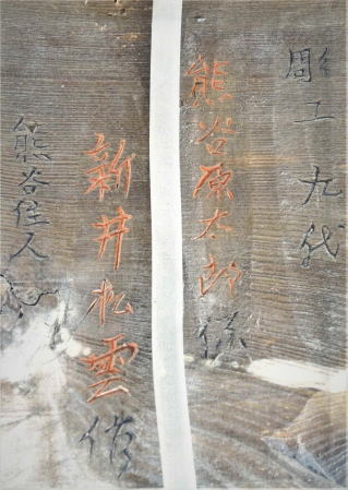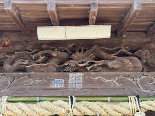 拝殿向拝頭貫上に龍の彫刻が施されており、裏面には「彫工九代 熊谷原太郎係 新井松雲作 熊谷住人」と刻まれています。