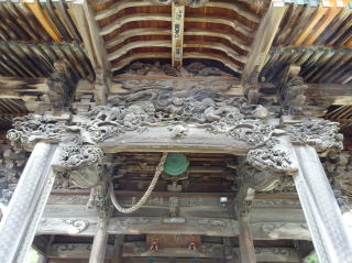 本堂は、大正15年(1926)に再建されたもので、本堂向拝蟇股に龍、木鼻に獅子が彫られています。蟇股の龍の裏には「本郡玉井 彫匠 佐藤正貫 謹刻」と刻まれています。流れるような火焔をまとう木鼻獅子の彫刻は、正貫晩年の作品として見事です。
