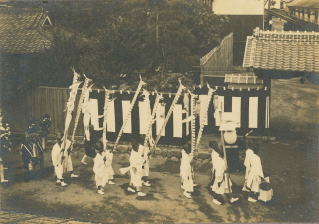 1枚目の写真は、提灯・旗・花を持った白装束の葬列が、白黒の幕がかけられた板塀の脇を通り、瓦葺きの門から邸内に入ろうとしています。