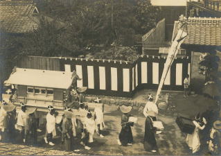 2枚目の写真は、龕(ずし:棺をのせて運ぶ輿)が白装束の輿丁(よてい:龕を担ぐ人)12名によって担がれており、被っている烏帽子には白いバツ印がつけられています。龕の前の旗には、最後の文字が読めませんが「故竹井澹□」と読め、竹井澹如の葬列であることがわかります。