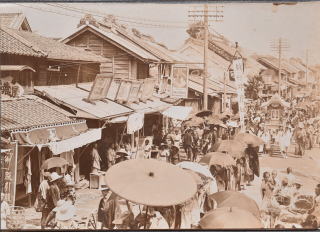 4枚目の写真は、葬列が、葬儀の行われる熊谷寺へ、中山道の本町付近を西に向かって進んでいます。葬列の僧や見物人の一部に傘をさしている人がいます。8月の暑い日に、当時男性も日傘をさす習慣があったとは思えず、にわか雨が降ったのか、あるいは死穢を覆い隠す習俗だったのかもしれません。葬列奥には棺を運ぶ龕(がん)が担がれており、その手前には「故竹井澹如之棺」と書かれた旗が見えます。