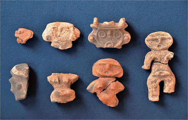 中でも土偶は、遺物包含層を中心に51個体と多数出土し、その時期は、後期中葉〜後葉が中心で、晩期前葉〜中葉のものも数点見られる。この他、土偶等の赤彩に用いたと考えられる辰砂(朱の原料となる水銀の鉱物)の小片22点やパレット状土器1点も出土している。